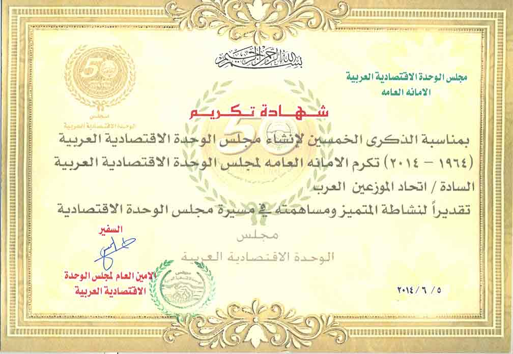 شهادة تكريم مقدمة من مجلس الوحدة الاقتصادية العربية الى اتحاد الموزعين العرب